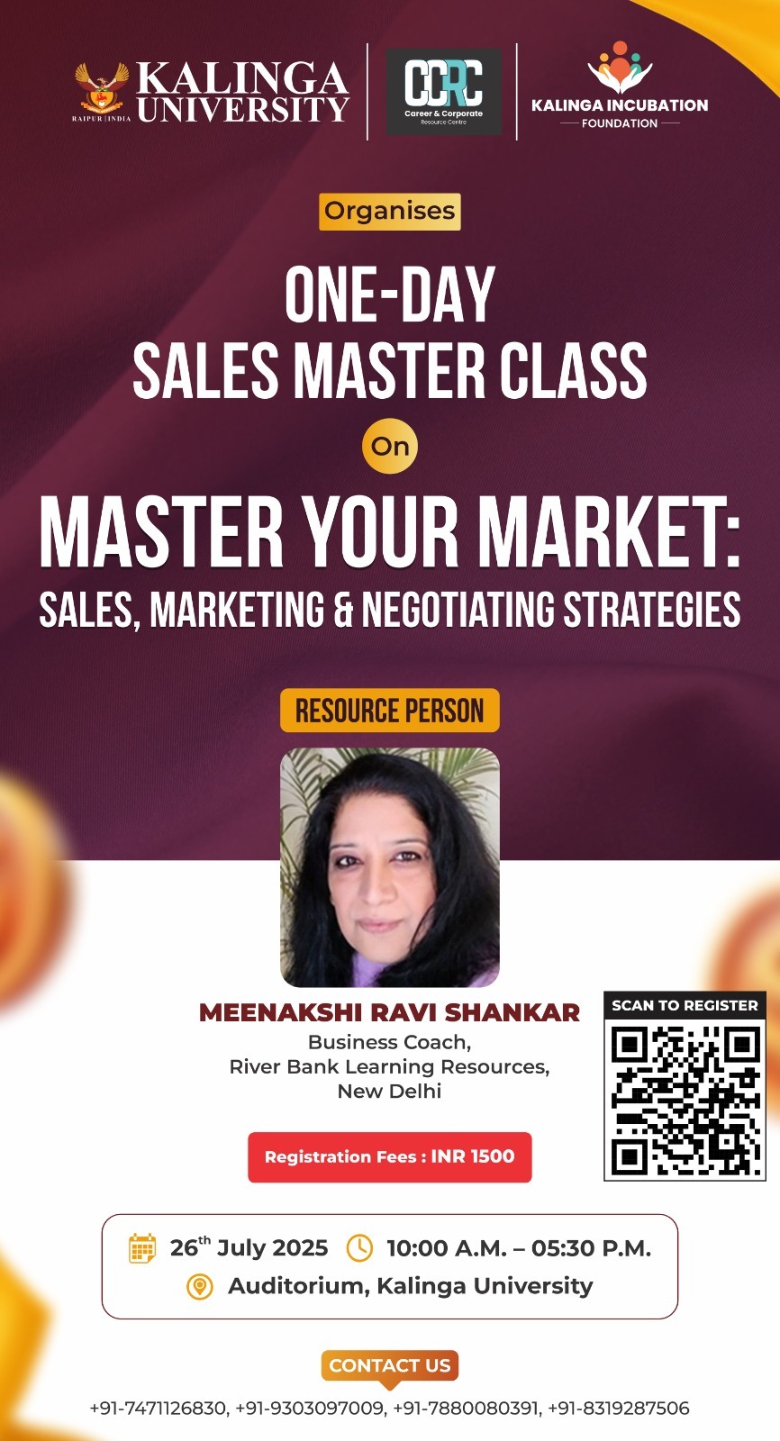 रायपुर, 30 जुलाई 2025 कलिंगा विश्वविद्यालय, नया रायपुर में “Master Your Market – Sales Strategies” विषय पर एक दिवसीय मास्टर क्लास का सफल आयोजन किया गया। यह आयोजन विश्वविद्यालय के Career & Corporate Resource Centre (CCRC) द्वारा किया गया, जिसका उद्देश्य प्रतिभागियों को व्यावसायिक बिक्री रणनीतियों की आधुनिक तकनीकों से परिचित कराना था।