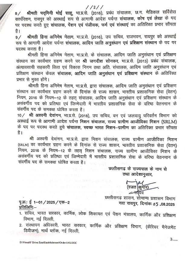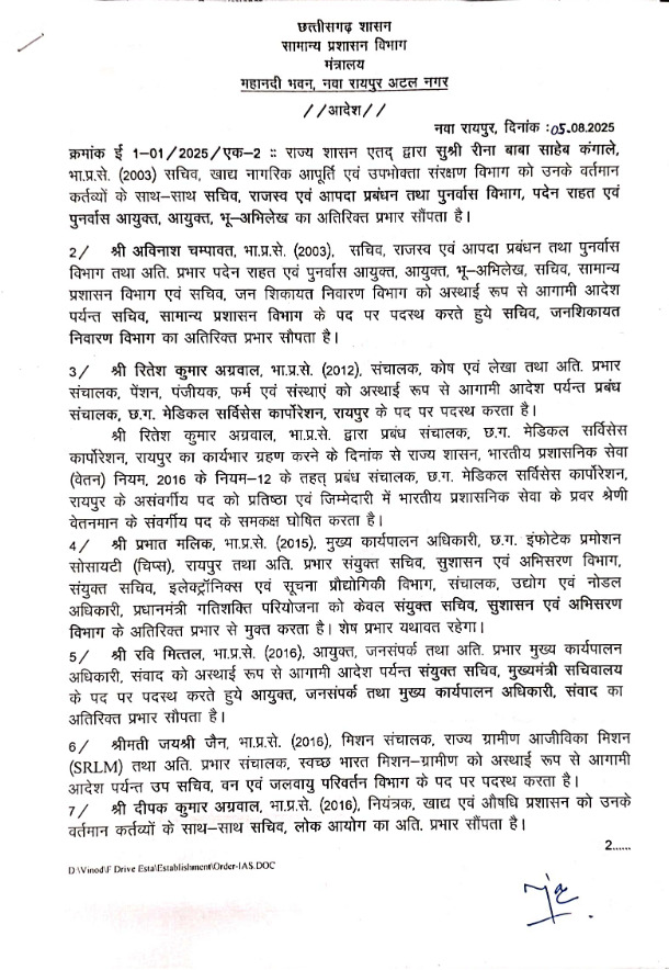 रायपुर, 5 अगस्त 2025 छत्तीसगढ़ राज्य सरकार ने एक बड़े प्रशासनिक फेरबदल के तहत कई IAS अधिकारियों की जिम्मेदारियों में बदलाव किया है।