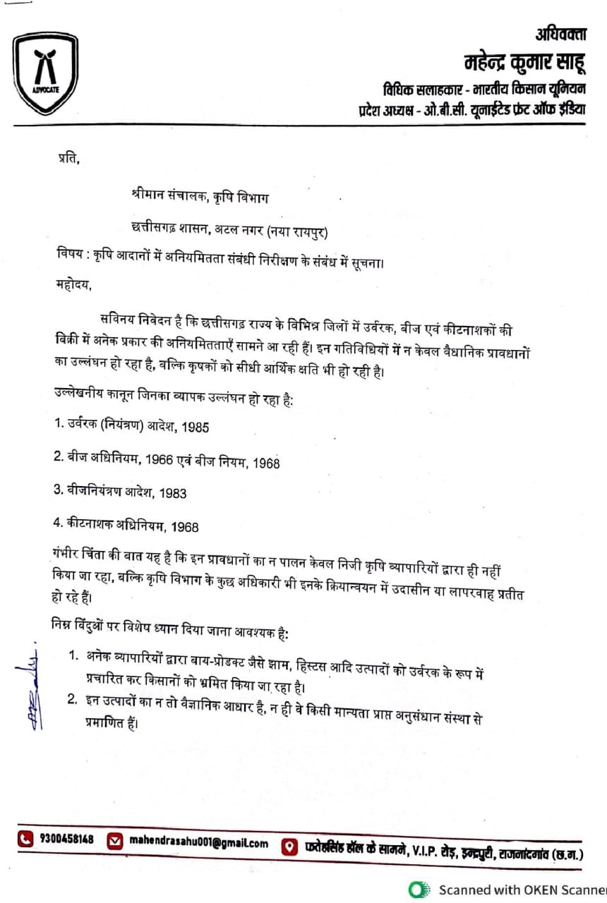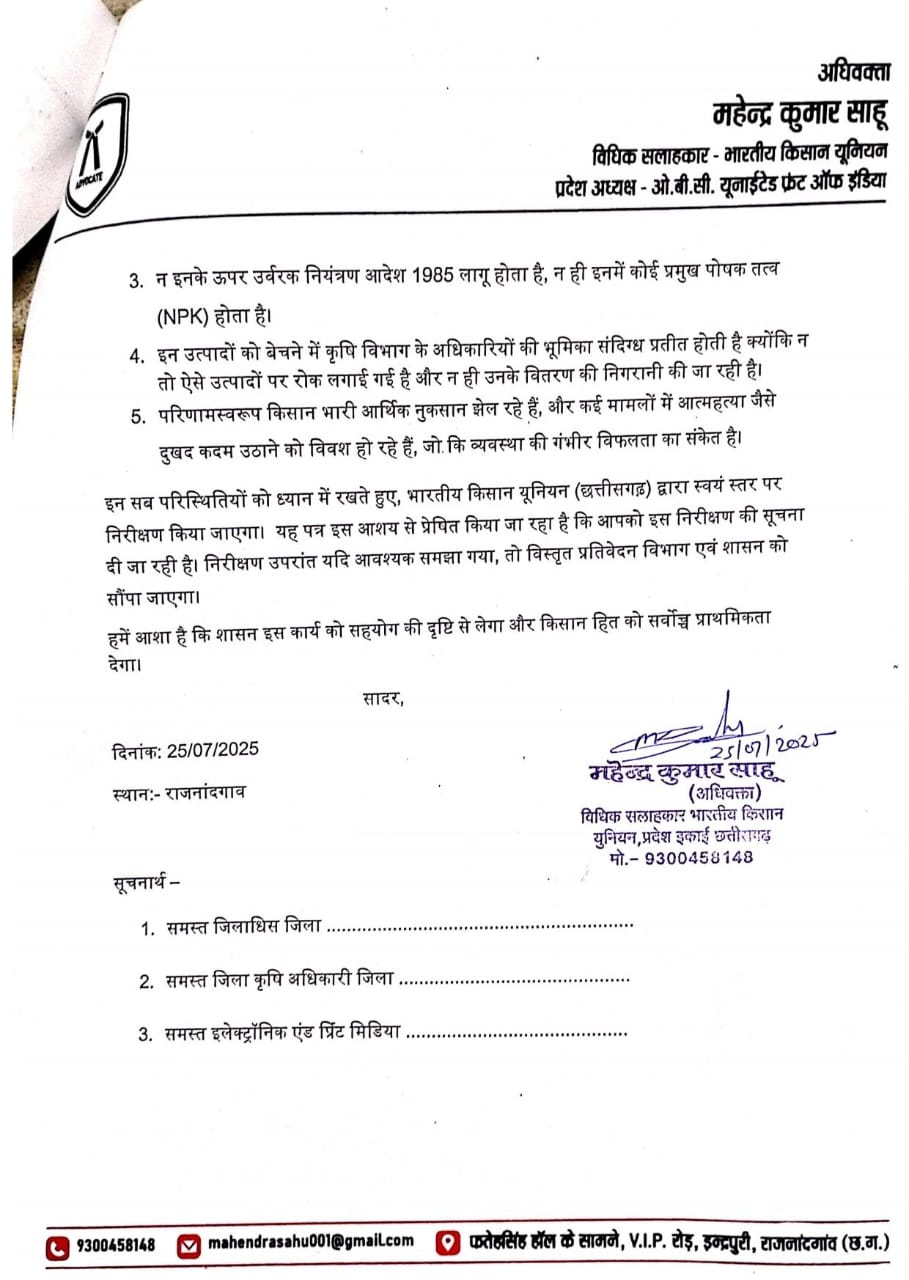 दिनांक: 30 जुलाई 2025 छत्तीसगढ़ के मोहला-मानपुर-अंबागढ़ चौकी ज़िले में किसानों के साथ एक बड़े धोखे का पर्दाफाश हुआ है। भारतीय किसान यूनियन (टिकैत) के विधिक सलाहकार अधिवक्ता महेन्द्र साहू की शिकायत पर स्थानीय चन्द्रा कृषि केंद्र में औचक निरीक्षण किया गया, जिसमें नकली कृषि उत्पाद की मौजूदगी की पुष्टि हुई।