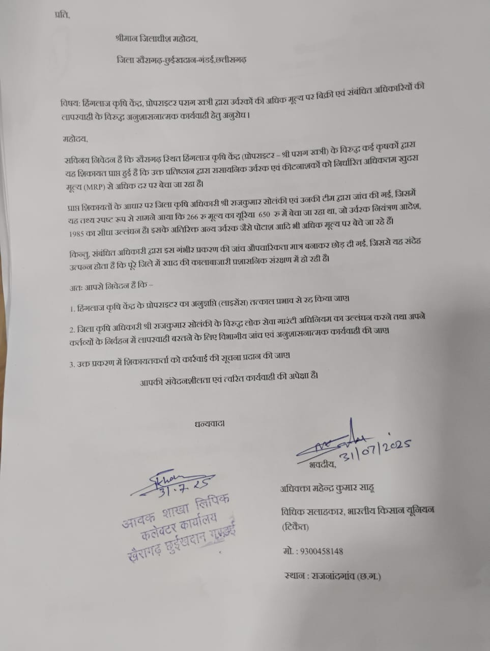 हालांकि कार्यवाही केवल यूरिया खाद तक सीमित रही, जबकि अन्य उर्वरकों की कालाबाजारी की भी शिकायतें सामने आई थीं। जब इस संबंध में भारतीय किसान यूनियन (टिकैत) के विधिक सलाहकार अधिवक्ता महेन्द्र कुमार साहू ने उपसंचालक श्री सोलंकी से पूछा कि कार्यवाही अधूरी क्यों की गई, तो उन्होंने उत्तर दिया: