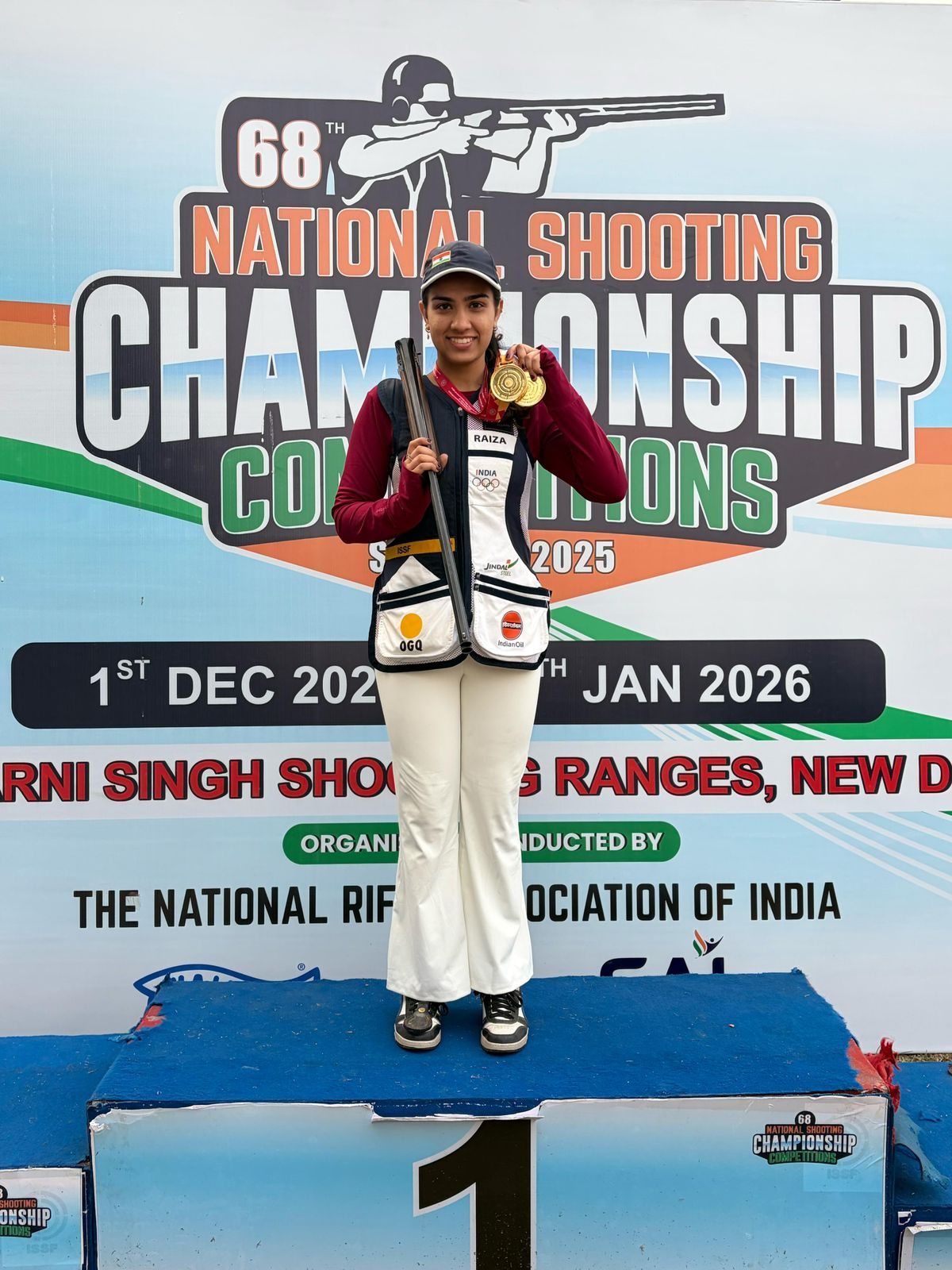महिला वर्ग में उभरती हुई स्टार राइज़ा ढिल्लों ने स्कीट शूटिंग में उत्कृष्ट प्रदर्शन करते हुए सभी का ध्यान आकर्षित किया। ढिल्लों ने महिला स्कीट और जूनियर महिला स्कीट—दोनों स्पर्धाओं में स्वर्ण पदक जीतकर अपनी असाधारण प्रतिभा का परिचय दिया। उनका यह डबल-पोडियम प्रदर्शन उन्हें भारतीय शूटिंग की सबसे आशाजनक युवा प्रतिभाओं में शामिल करता है।