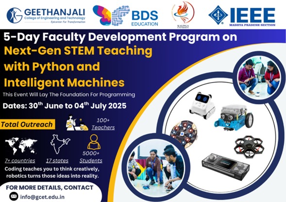 कलिंगा यूनिवर्सिटी के आईईईई छात्र शाखा के नेतृत्व में, भारत ड्रोन सिस्टम और आईईईई मध्य प्रदेश अनुभाग के सहयोग से 30 जून से 4 जुलाई 2025 तक गीतांजली कॉलेज ऑफ इंजीनियरिंग एंड टेक्नोलॉजी, हैदराबाद में “पाइथन और बुद्धिमान मशीनों के साथ अगली पीढ़ी के STEM शिक्षण पर 5 दिवसीय संकाय विकास कार्यक्रम”का आयोजन किया गया।