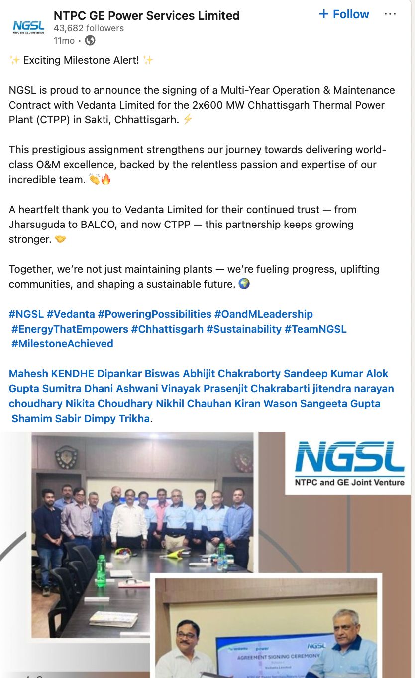 सूत्र बताते हैं कि संयंत्र का प्रचालन और रखरखाव एनजीएसएल द्वारा द्वारा किया जा रहा था। एनजीएसएल कंपनी का गठन एनटीपीसी लिमिटेड और जीई पावर सिस्टम्स की भागीदारी से हुआ है। दोनों ही दिग्गज कंपनियों का शेयर एनजीएसएल में 50-50 फीसदी का है। वेदांता के सिंघीतराई विद्युत संयंत्र में प्रचालन और रखरखाव का काम यही एनजीएसएल दीर्घकालिक अनुबंध व्यवस्था के तहत कर रही है। हाल ही में हुए हादसे से तकरीबन 11 महीने पहले एनजीएसएल ने अपने एक लिंक्डइन पोस्ट में घोषणा की थी कि सिंघीतराई के 2 गुणा 600 मेगावॉट छत्तीसगढ़ थर्मल पावर प्लांट की यूनिट-1 के प्रचालन एवं रखरखाव का एक दीर्घकालिक अनुबंध उसे मिला है। इसी यूनिट-1 के प्रचालन में बड़ा दुःखद हादसा हुआ जिसमें कई लोगों को असमय ही जान गंवानी पड़ी।